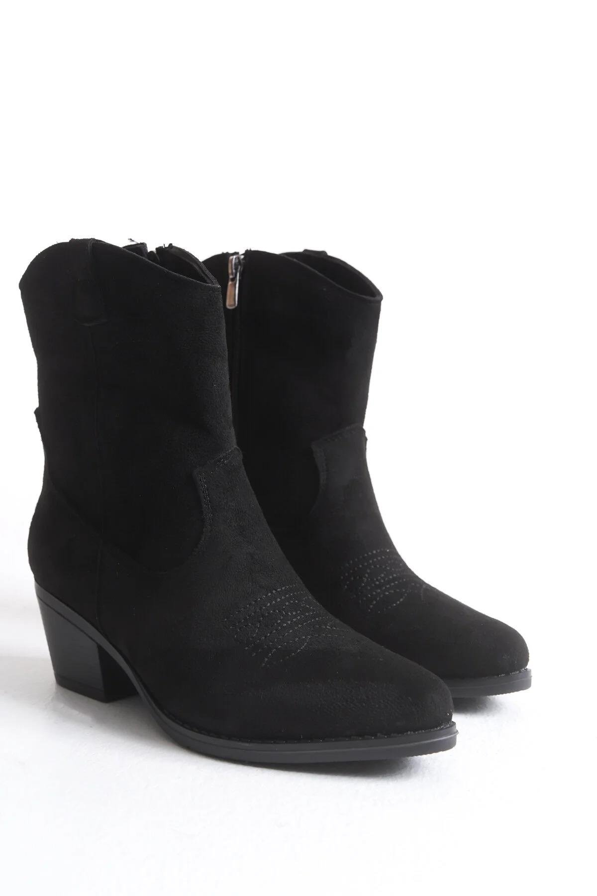 Kadın Kovboy Bot - Western Tarz Kadın Kısa Bot Nakışlı Cowboy Kadın Bot Siyah Süet (C9-S0000-00002)