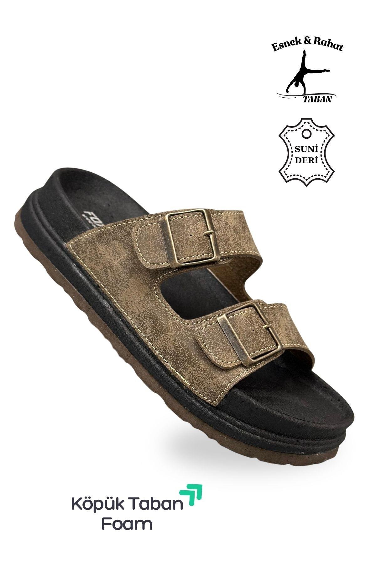 Sermoda Çift Toka Ayarlanabilir Genişlik Köpük Taban Rahat Deri Erkek Terlik Vizon